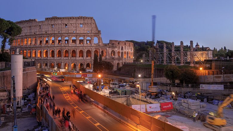 Building of the underground Piazza Venezia station continues. Utilizing a 185-ton hydro-milling machine, employees are excavating an 85-ft-deep perimeter for set up of 170 5-ft-thick diaphragm partitions. The staff will then coordinate excavation for the station’s six 48,400-sq-ft ranges along side archeological work that has uncovered Roman and medieval constructions, together with traces of the traditional By way of Flaminia and multistoried residential complexes. Greater than 1,500 devices have been put in on adjoining church buildings and historic buildings to observe development. The station is scheduled to open in 2032.