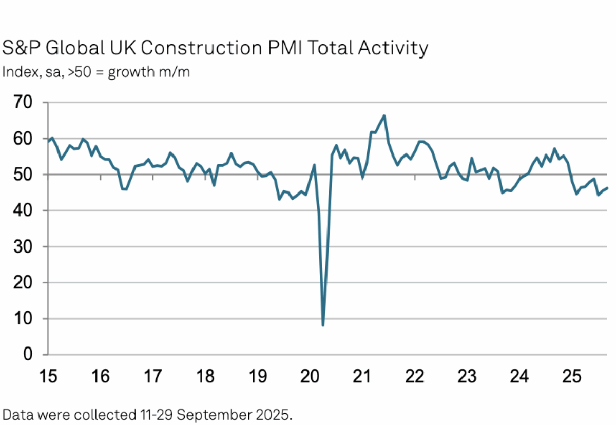 The bellwether S&P International UK Building Buying Managers’ Index recorded 46.2 in September up from 45.5 in August.
