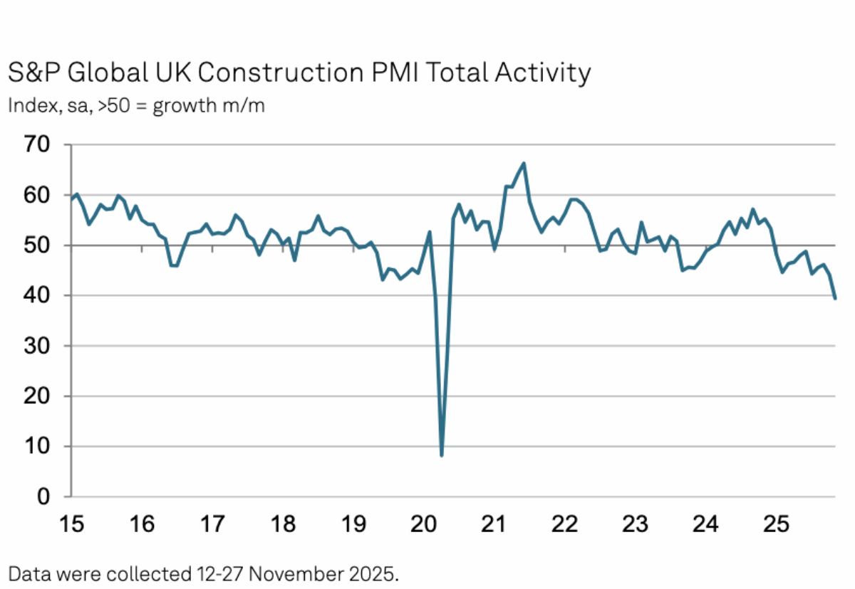 “Whole trade exercise decreased to the best extent for five-and-a-half years, led by steep falls in infrastructure and residential constructing work. Business building additionally confronted extreme headwinds throughout November as enterprise uncertainty within the run as much as the Finances pushed shoppers to defer funding choices.