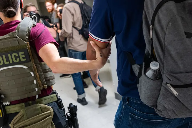 Federal brokers detain a person as they patrol the halls of immigration courtroom on the Jacob Ok. Javitz Federal Constructing on July 8, 2025, in New York Metropolis, New York.